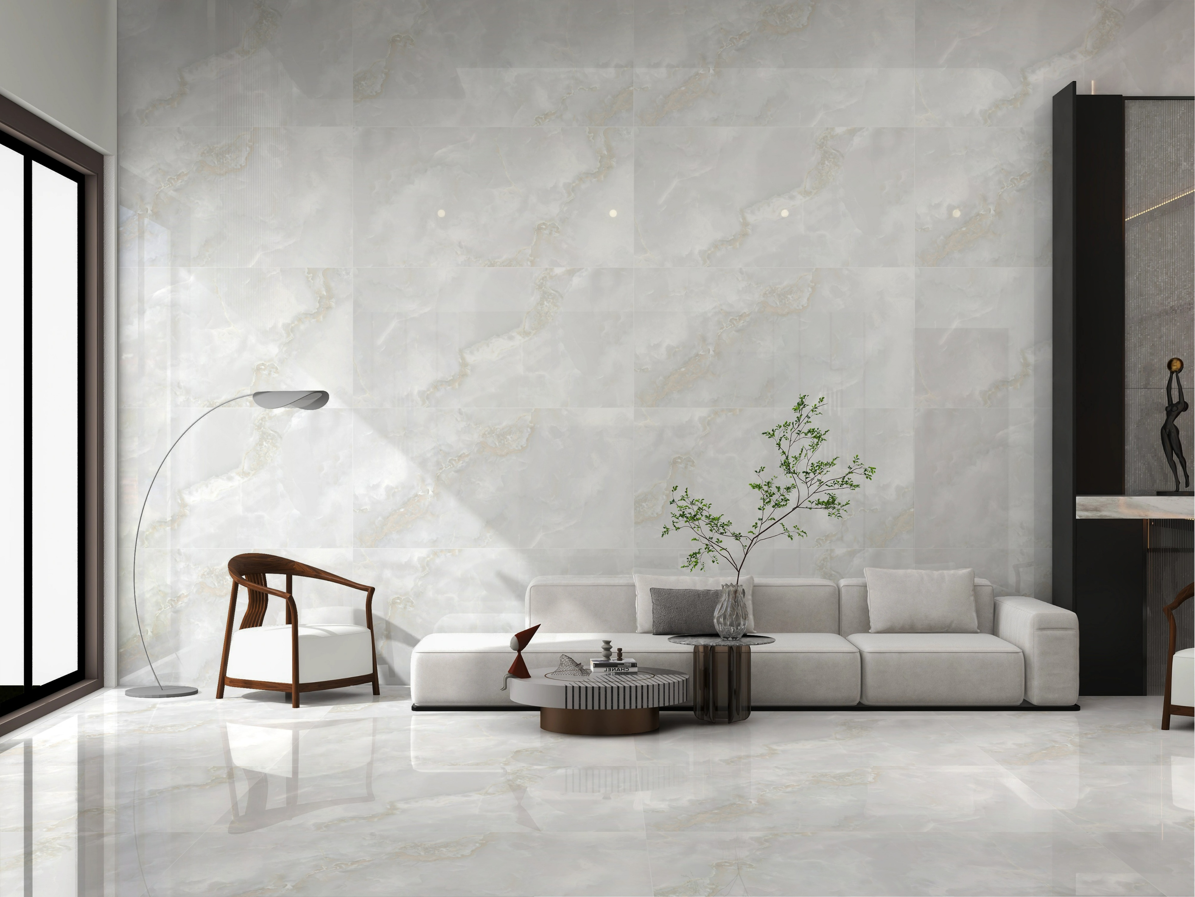 Magasfényű, polírozott porcelán burkolólap.