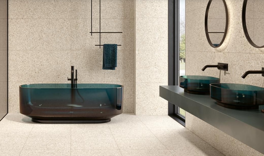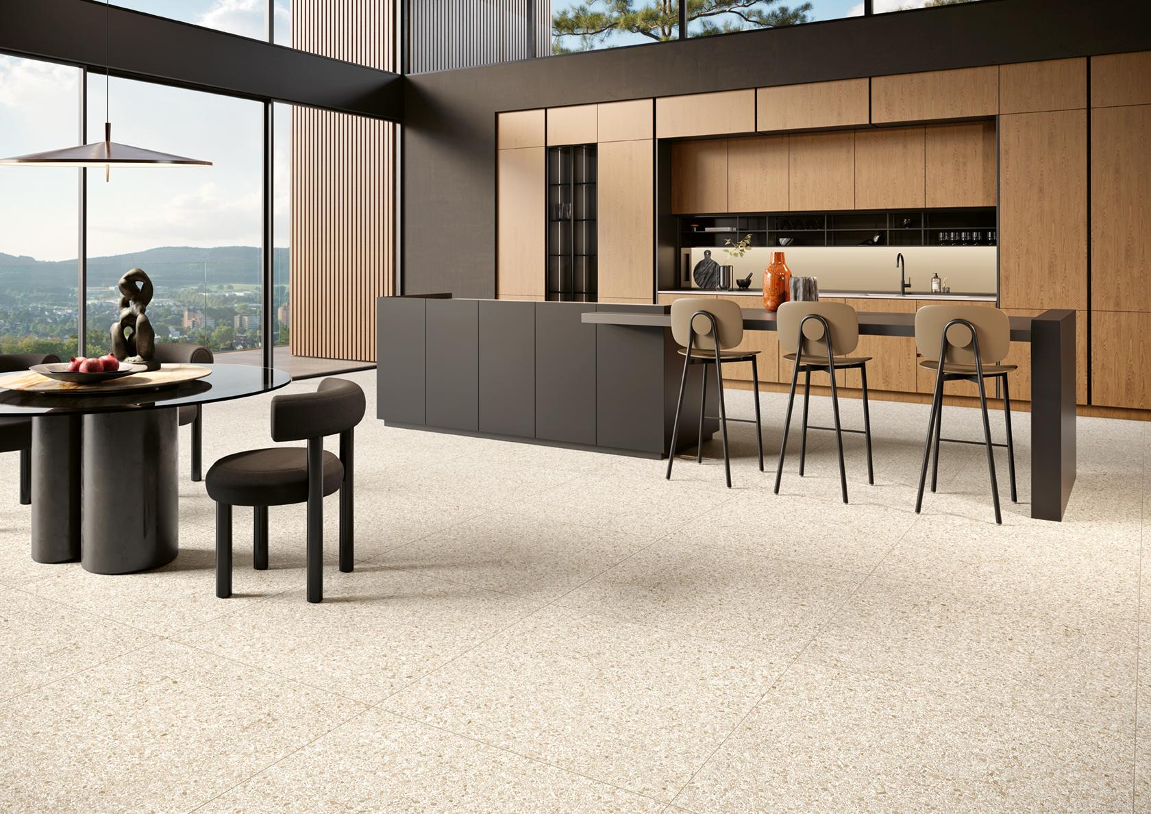 Terrazzo hatású, modern burkolat.